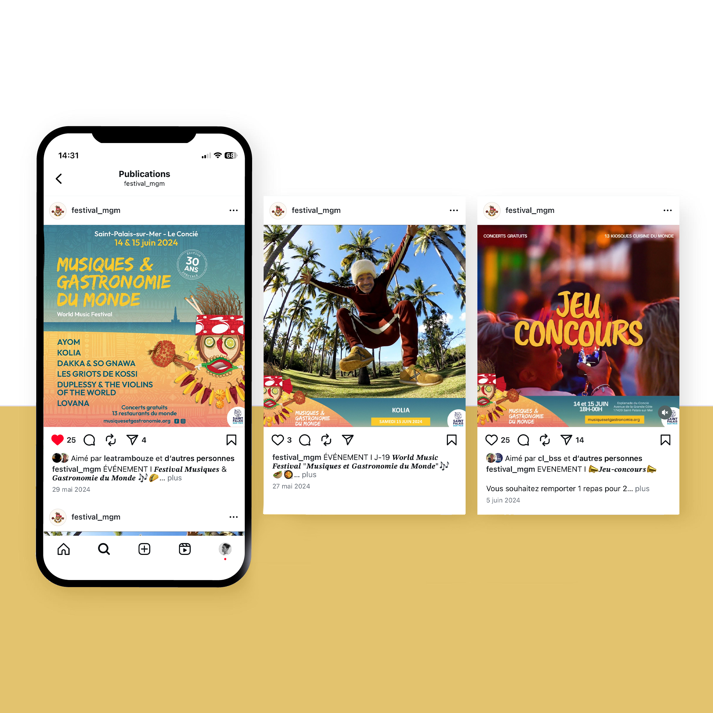 Conception de l’affiche officielle du festival Musiques & Gastronomie du Monde à l’occasion de sa 30ᵉ édition, organisée à Saint-Palais-sur-Mer. Le visuel célèbre la diversité culturelle et culinaire de l’événement à travers une composition colorée et festive. Le projet comprend également la déclinaison de l’affiche en différents formats pour la communication locale dans le pays royannais ainsi que pour les supports numériques et réseaux sociaux .
